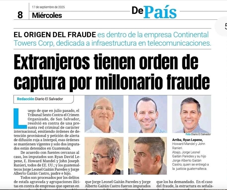 The other two who find themselves hit with the same red notice, in which, according tolocal media, prosecutors cite “aggravated fraud, extortion, and illicit associations”against the Latin American telecommunications company Continental Towers and its affiliates, are Guatamalan citizens who are already incarcerated in Guatemala and awaiting extradition and trial having been charged of alleged connected offences in El Salvador under the title of “aggravated theft and illicit association” (with Peppertree and Goldman Sachs).